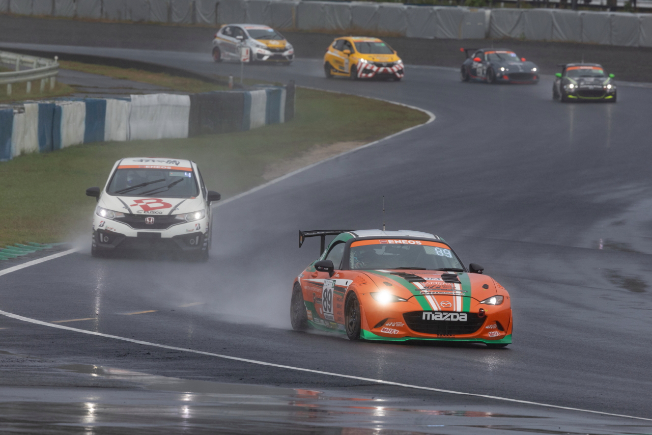 今シーズンのST-5Rクラス最終戦となる岡山ラウンドには、ST-5RクラスとST-Qクラス合わせて9台のマツダ車がエントリー。 舞台となる岡山国際サーキットは、コースの幅が狭く、コーナーの多いコースであるため、決勝レースが2グループに分けて行われ、マツダ車は全てGr.2に含まれます。これまでの5戦を終えて、ST-5Rクラスのシリーズチャンピオン獲得の権利は、ポイントリーダーの88号車と610号車にのみ残されて最終戦を迎えています。土曜日の予選は、午前中のフリー走行から雨が降り始め、午後はウェットコンディションとなり、弱い雨が降ったり止んだりする中、予選では88号車が開幕からの6連続ポールポジションを達成しています。