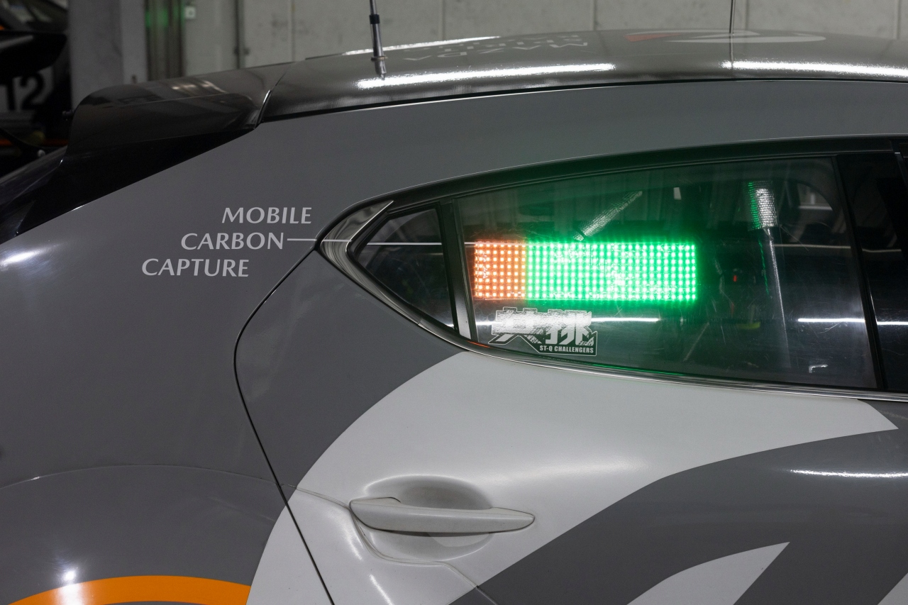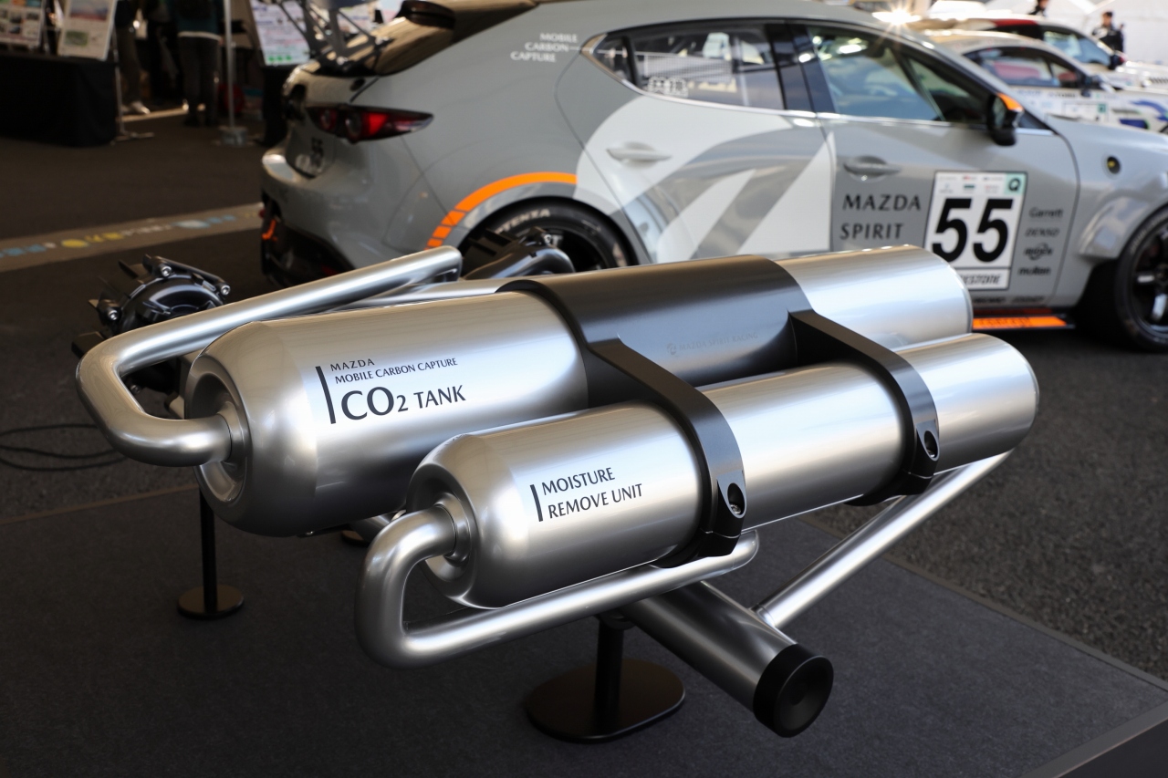 55号車のCO2回収装置について、マツダ(株)ファクトリーモータースポーツ推進部部長の上杉康範は、「今回初めて投入するCO2回収装置”MOBILE CARBON CAPTURE”は、SKYACTIV-D 2.2ディーゼルターボエンジンの排気管にバイパスを設け、排気ガスから水分を分離したのちタンクにつめた多孔性鉱物の”ゼオライト”にCO2を貯める仕組みとなっています。元々このクルマは、バイオマス由来のベースオイルと再生可能エネルギーから製造されたグリーン水素とで製造されるカーボンニュートラル燃料HVOを使用することで軽油に比べて90%のカーボンニュートラルを実現しており、今回のCO2回収装置で残り10%を埋め、将来的にはカーボンネガティブに資することを期待しています。つまり、走れば走るほどCO2を減らすクルマの実現が可能となるのです。今回装着しているCO2貯蔵タンクはカートリッジ式となっており、取り外して重量を計測することでCO2がどれだけ回収できたかを測ることができます。4時間レースでは、約100gのCO2が回収できると予測しています。今回の装置は実際にレースカーを走らせて、CO2が回収できることを確認することが目的であり、本格的カーボンネガティブを実現し環境貢献するのは次のステップということになります。さらに回収したCO2を農産物の成育などにリユースしたり、プラスティックやガラスなどに固定化したりするためには、私たちだけでなく他の産業からの参入をも待たなければなりません」、と語っています。
