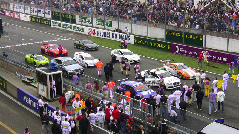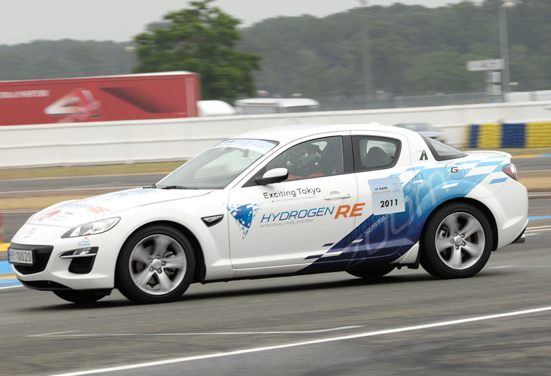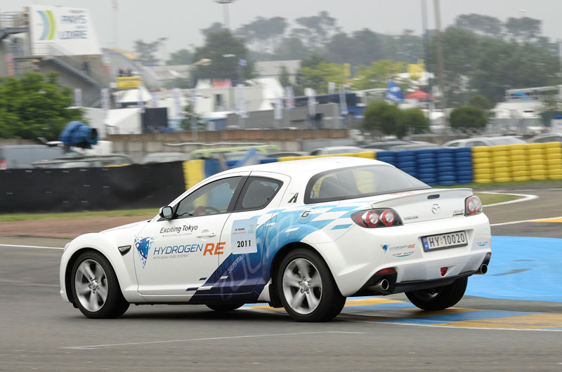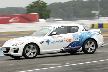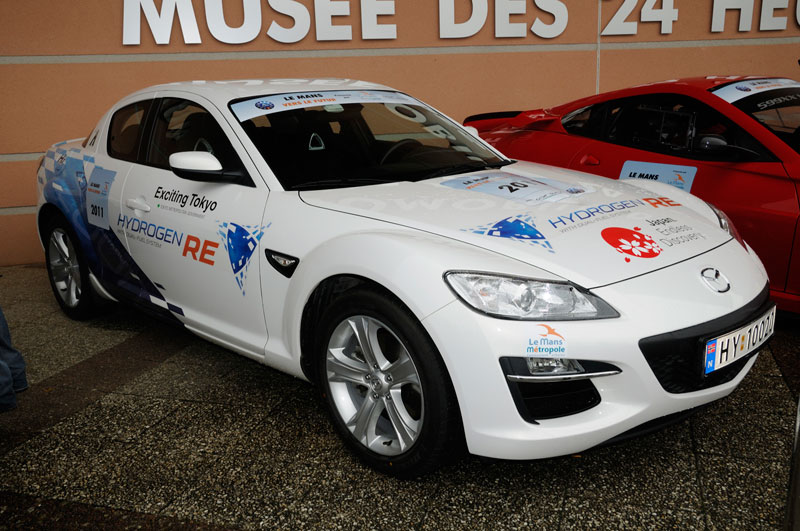 Just before the start of this year's Le Mans 24 Hours, there was a demonstration run of new energy cars such as the PORSCHE 911 Hybrid, the AUDI e-Tron, the PEUGEOT Hybrid, the electric FERRARI, the electric TESLA, the natural gas-powered VOLKSWAGEN, the hydrogen BMW. The Hydrogen Rotary MAZDA RX-8 was also entered in the event, driven by Mr. Yojiro Terada.