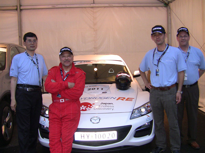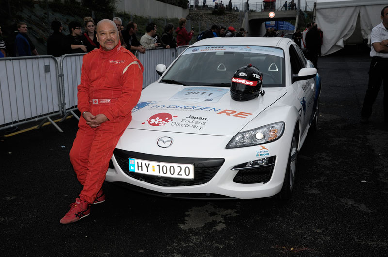 Mr. Terada commented, "It is admirable that the ACO, the Le Mans organizers, put on such a demonstration run, speculating on the near future. Also, I'd like to show my respect to MAZDA, who has developed and nearly mass-produced the clean hydrogen rotary engine and for bringing the car to Le Mans. The Hydrogen Rotary RX-8 is almost the same as the mass production model except that it uses hydrogen energy. I felt the car was the most realistic among those advanced cars taking part in the demonstration run. I am proud to run at Le Mans with this hydrogen-powered rotary engine equipped car of the near future. In the practice session held on the day before the event, I had the vice mayor of the city of Le Mans ride in the passenger seat of the hydrogen RX-8. He was most impressed with the experience and that made me very glad," he added.