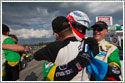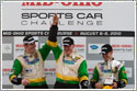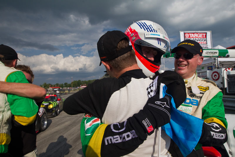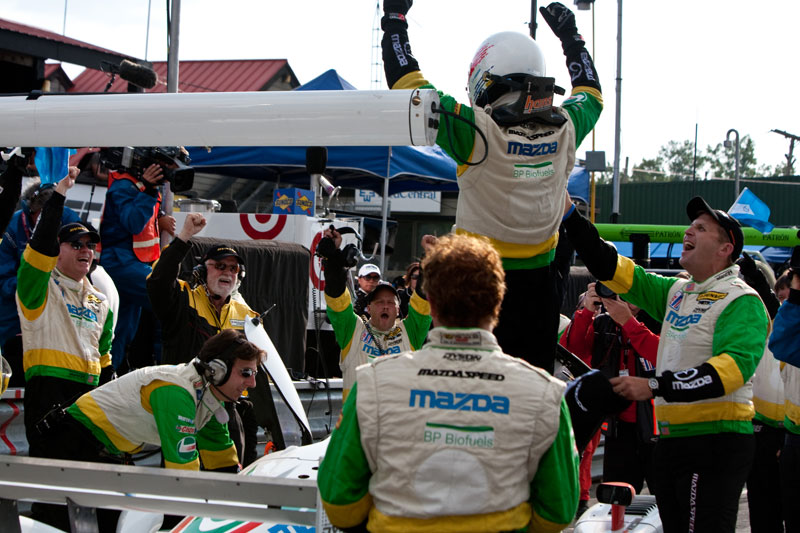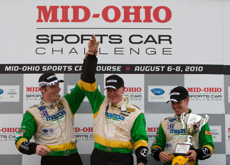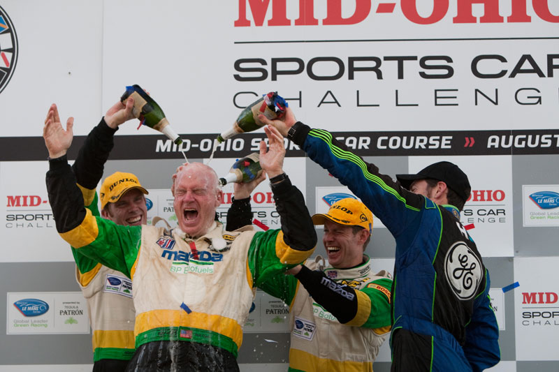 It was a sweet victory. As has become the tradition when Dyson Racing wins at Mid-Ohio, Rob Dyson was drenched with multiple bottles of champagne in victory circle after Chris Dyson and Guy Smith won the Mid-Ohio Sports Car Challenge in their #16 Castol Mazda Lola coupe. It was the first overall American Le Mans Series victory for Mazda, for BP Biofuel Isobutanol, for Dunlop tyres, for Guy Smith and Chris Dyson, and for Castrol. It was a new race record and Dyson set the car's fastest lap four laps from the end.