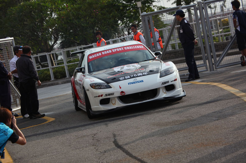 Driver Tatsuya Tanigawa said, "I was trapped by cars on either side, and both front wheels were broken so I was unable to do anything. It is a real shame that the race ended after just a few seconds." Also team representative Hidefumi Nakamura said, "The RWD RX-8 is at a disadvantage in the start dash compared to the AWDs. We thought that after reaching 3rd gear speed, the advantage would be ours, although at the start we would be overtaken, but we are at our wits' end when squashed from both sides and having our path blocked. It is a real disappointment, but we have to accept that this is also a part of racing. We hope to continue to participate at Macau in the future if there is a category suitable to us."