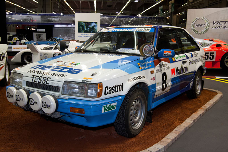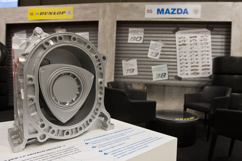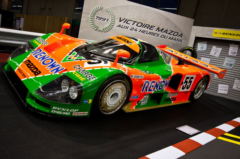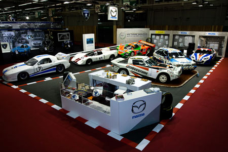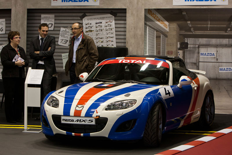 Rétromobile is an exhibition and trade show for antique road and racecars, along with related parts, merchandise, models and publications. This year, the 20th anniversary of its victory in the 24 Hours of Le Mans in 1991, MAF's booth mainly focused on Mazda's motorsports history. The company borrowed a replica Mazda 787B from the ACO Museum in Le Mans, which was displayed along with a Mazda RX-7 Group B rally car owned by a Belgian enthusiast, the Mazda 323 Group A machine that appeared as part of the Mazda Rally Team Belgium from the European Rally Championship, and the Chevron B16 Mazda that was the first car with a rotary engine at Le Mans (the engine has since been switched from the 10A used at the time to a 12A), among others. Joining these retro machines was a 2010 Mazda MX-5 created for a one-make endurance race to celebrate the 20th anniversary of the sale of the Roadster.