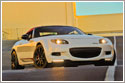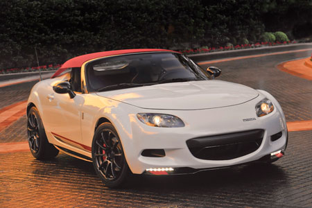 The MX-5 Spyder is a re-imagination of the roadster and features a sweeping, single-panel grenadine-red soft-top. Fitted onto the roadster's already sleek and sexy body style, the MX-5 Spyder has been painted Stratosphere White. Powered by Mazda's ever-dependable MZR 2.0-liter engine, the MX-5 Spyder is fueled by BP's isobutanol.